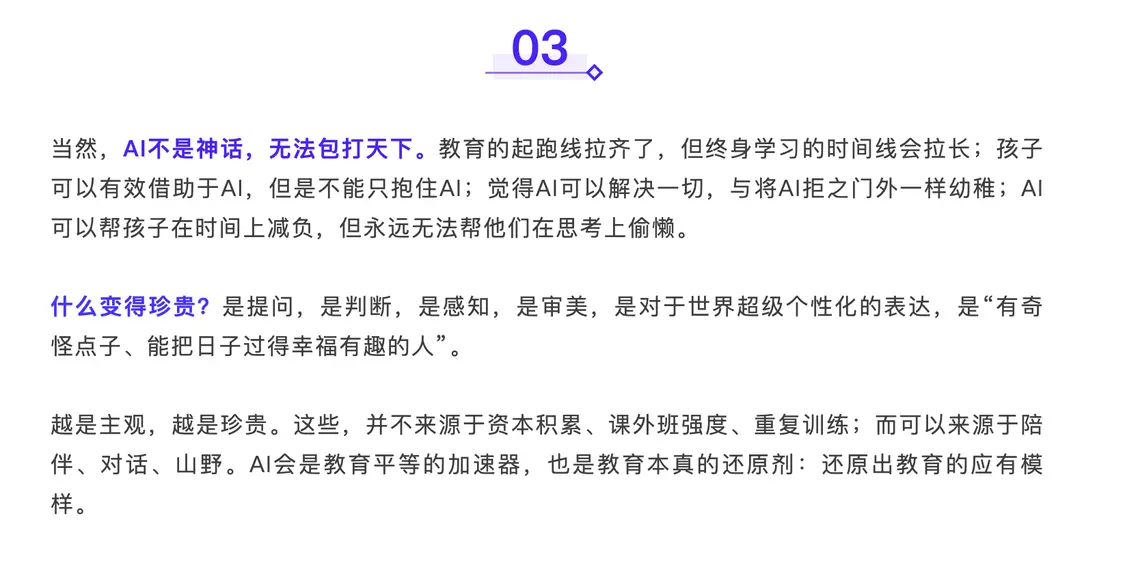 文章认为,ai对教育的核心影响可能在于学习方式的转变:从知识灌输转向以提问和探索为核心的“贪吃蛇式”学习。知识本身不再稀缺,提出好问题与培养判断力变得更为关键。ai时代,因为个性化教育,因为不断的追问,学习可以更有效率,更加的专注带来更加的专业,教育年限有可能缩短。